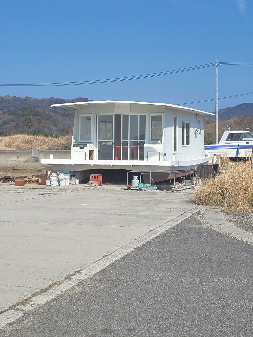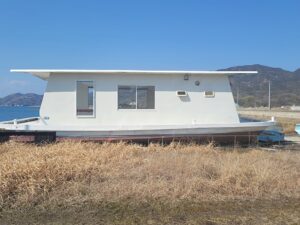 下のキャビン艇はどこの県か忘れましたが購入して🛳️漁船で曳航中船底に穴が開いて🧜🏻♂️沈没しかけて近くの港へ寄り🏗️クレーンで上架。その後、縦に真っ二つに切断!トレーラー2台で大島まで運び港でまた接続して組み立ててました。😲