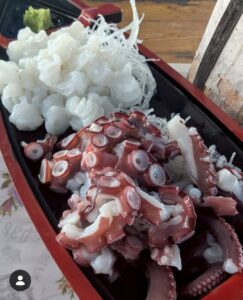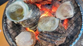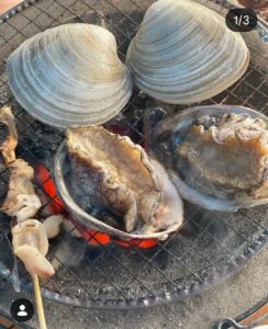 🍽️BBQの料金は入店料金が1人¥500で伊勢海老、アワビが100g¥1100で伊勢海老の大がだいたい¥8000程になります。サザエは大で¥800,はまぐりが1個¥450冷凍ホタテが1個¥150、他串に刺さった🦑イカやタコ野菜などは¥300~¥600程です。🦐伊勢海老・真鯛・メバル・🐙蛸は刺身にしてもらえます。絶品(*^_^*)