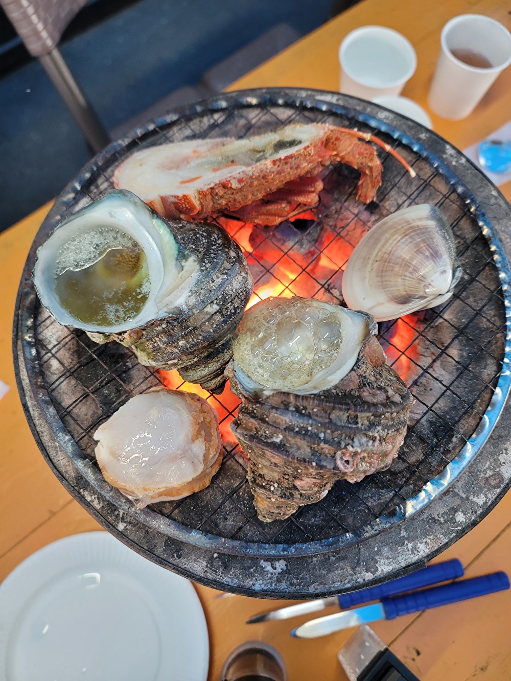 受付した後海鮮BBQ食材を取りに行きテーブルに置かれた七輪で焼いて食べます。😲